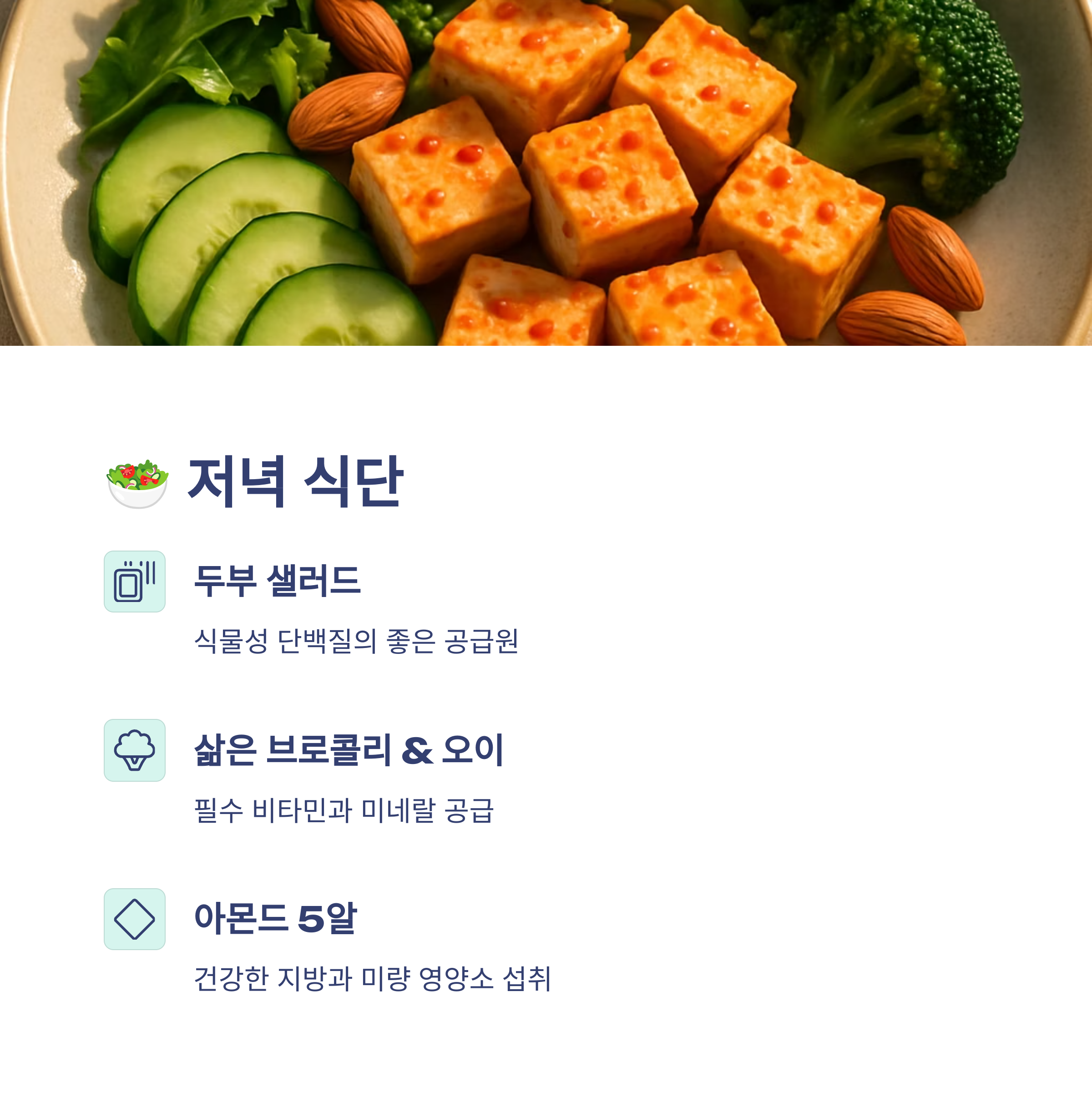 | 단백질 | 25~35% / 닭가슴살, 생선, 두부, 달걀 등 고단백 저지방 식품 |