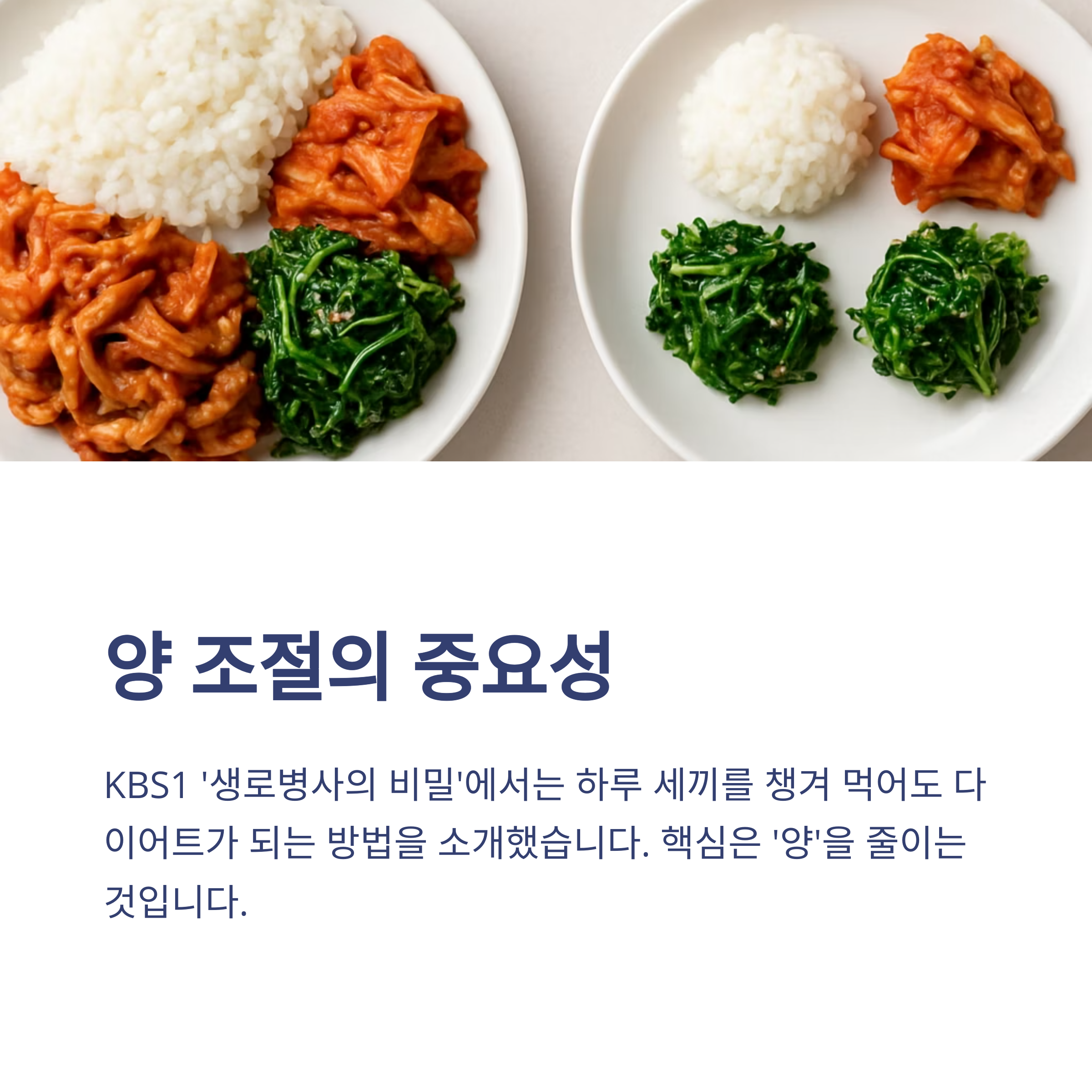 | 양 조절 | '생로병사의 비밀'에서 하루 3끼 유지하며 소량식사로 체중 감량 성공 |