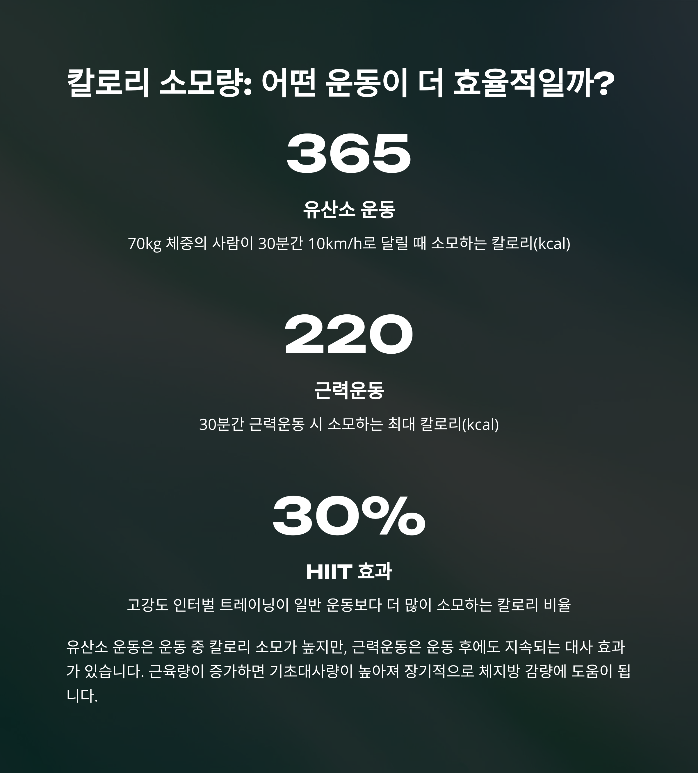 | 근력 운동 | 약 130~220kcal | 운동 후 대사효과 지속 |