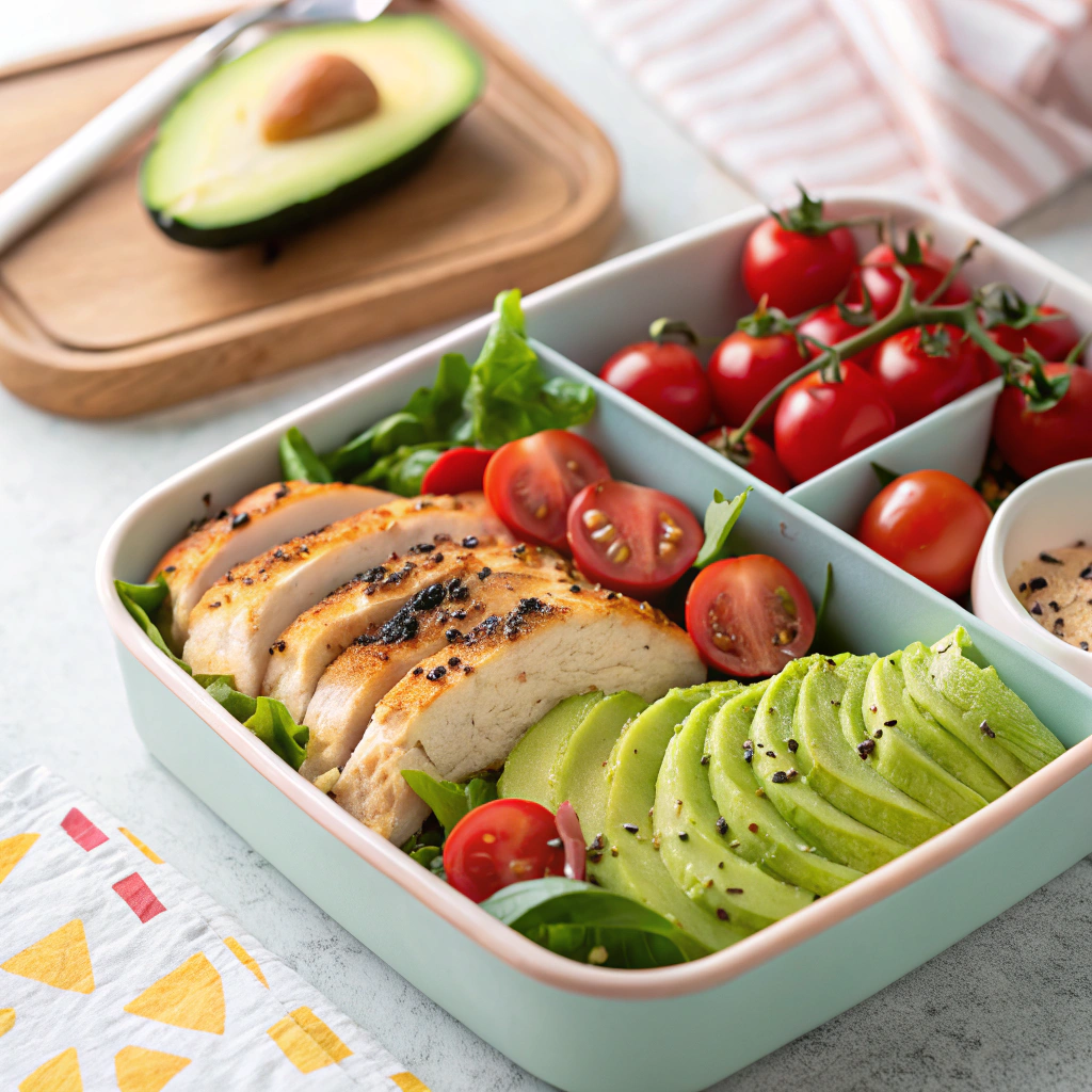- 닭가슴살 샐러드 도시락: 닭가슴살 + 채소 + 아보카도 + 레몬 드레싱