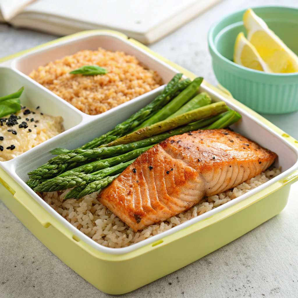 - 연어 스테이크 도시락: 연어 + 현미밥 + 아스파라거스