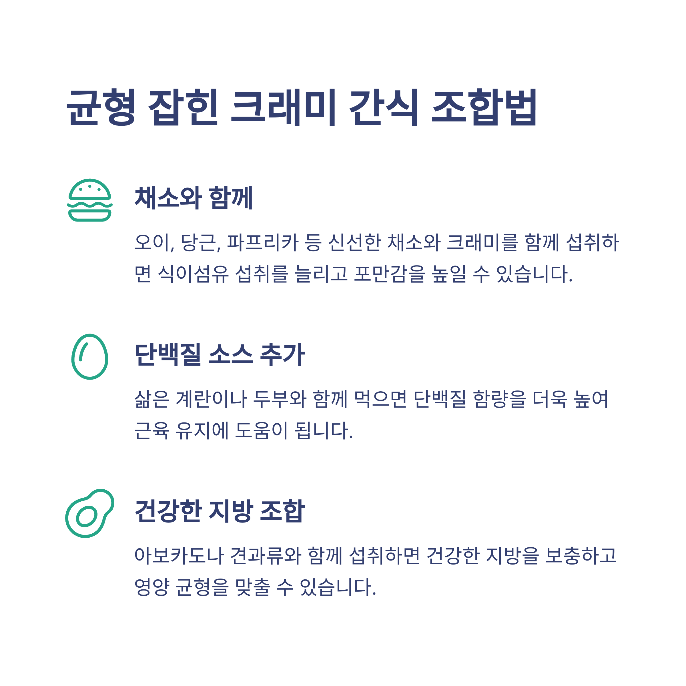 크래미는 단백질 공급원으로서 근육 유지, 간식 대용, 체중 관리에 좋고, 저지방 특성 덕분에 콜레스테롤 관리에도 유리할 수 있어요.