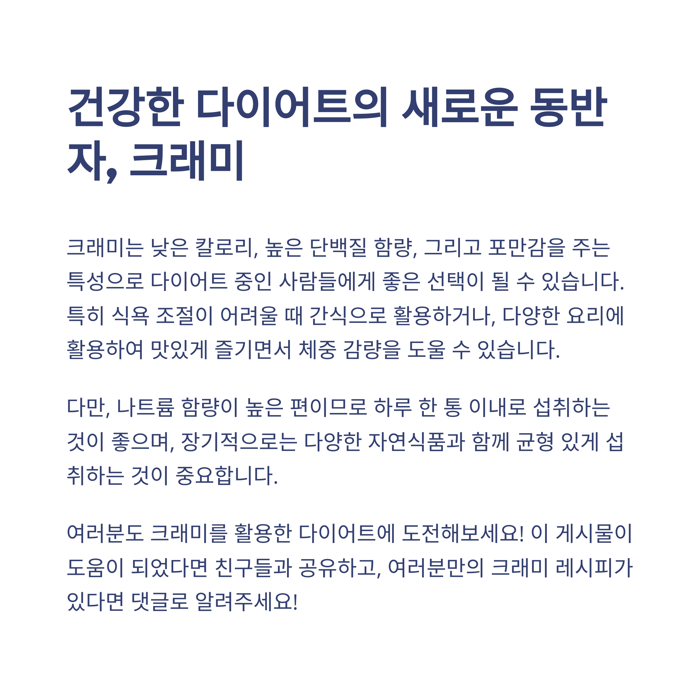 크래미 다이어트는 정말 ‘맛있게’ 체중을 줄이고 싶은 분들에게 딱이에요. 물론 만능은 아니지만, 간식 유혹이 강한 저 같은 사람들에게는 큰 도움이 되더라고요. 오늘 소개한 정보와 요리법이 여러분의 건강한 다이어트에 작은 실마리가 되길 바라며, 여러분만의 크래미 레시피나 꿀팁이 있다면 댓글로 꼭 공유해주세요! 우리 같이 꾸준히 건강한 몸 만들어봐요 😊