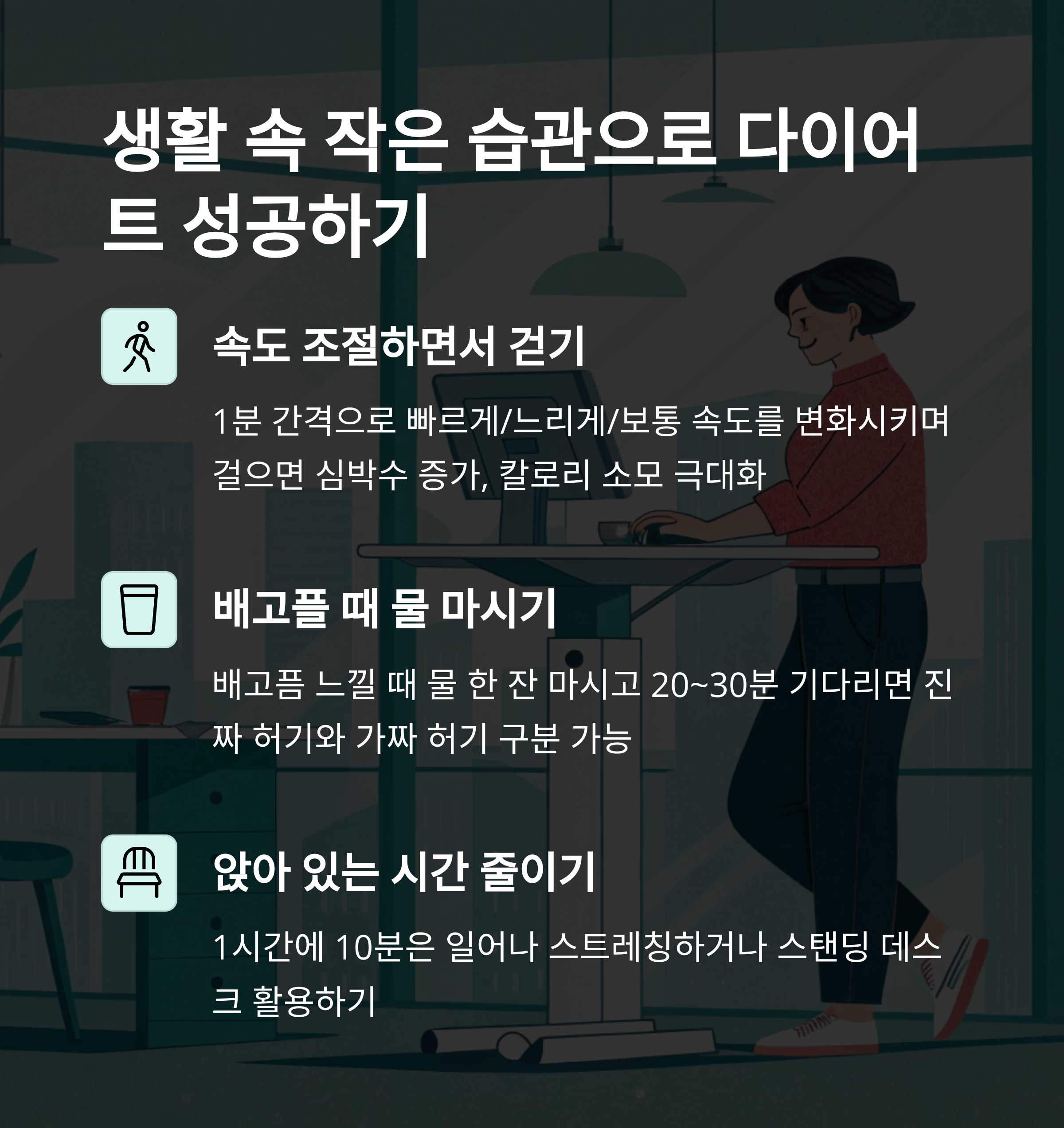 다이어트, 식단조절없이살빼기, 건강한습관, 생활습관개선, 수면과다이어트, 공복물효과, 걷기운동, 인터벌워킹, 배고픔조절, 앉은시간줄이기