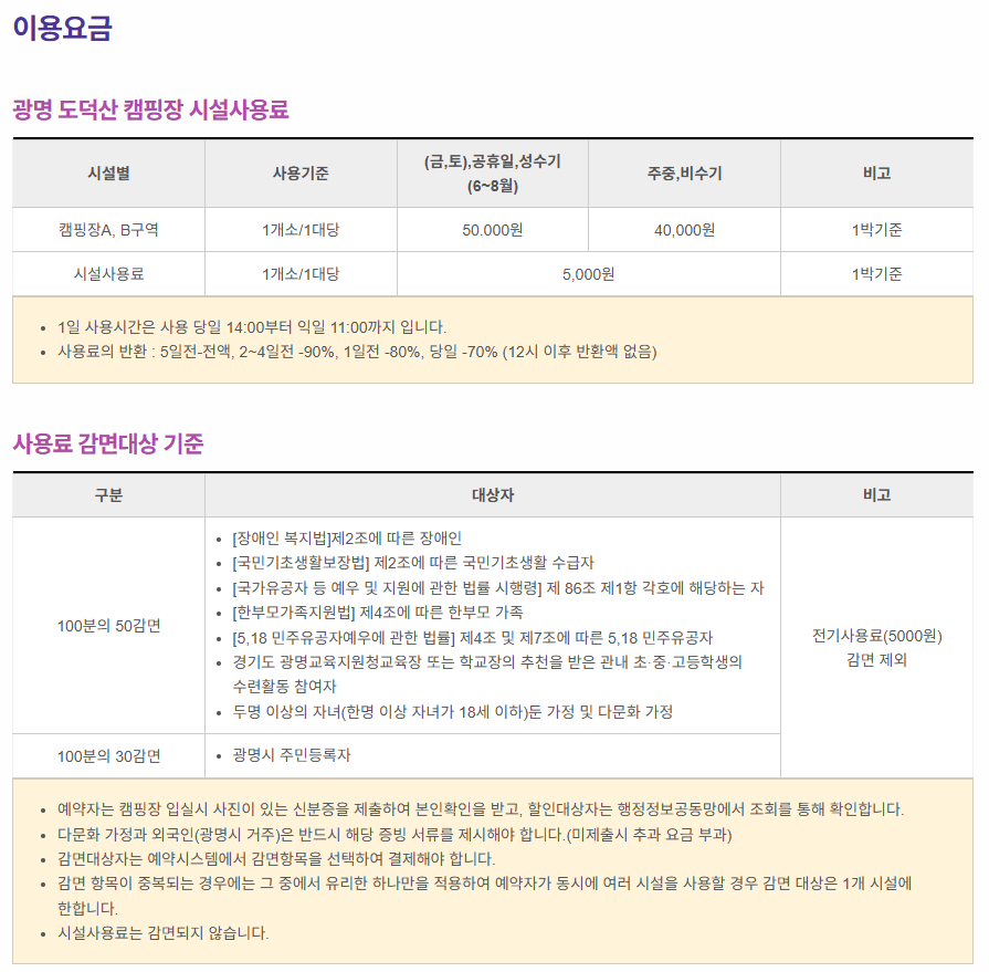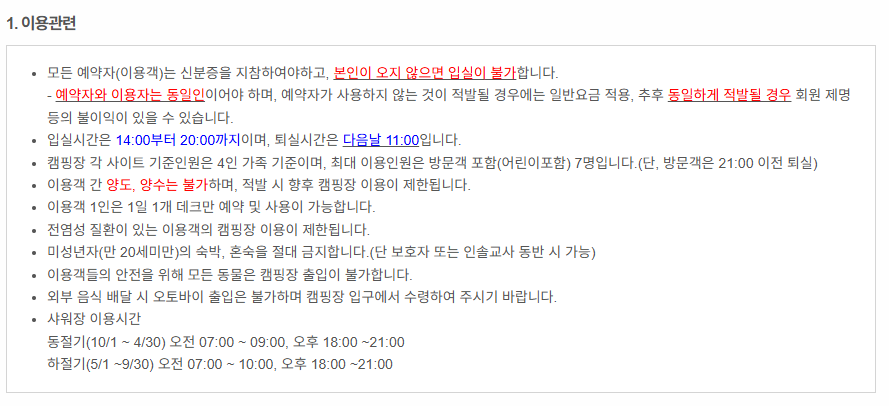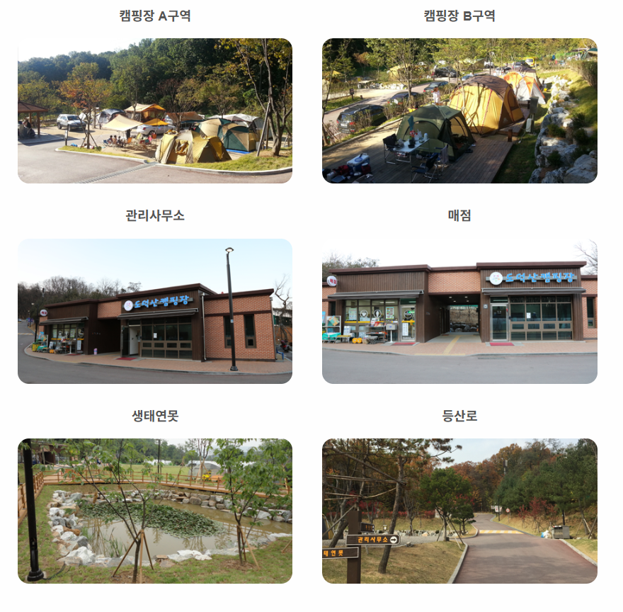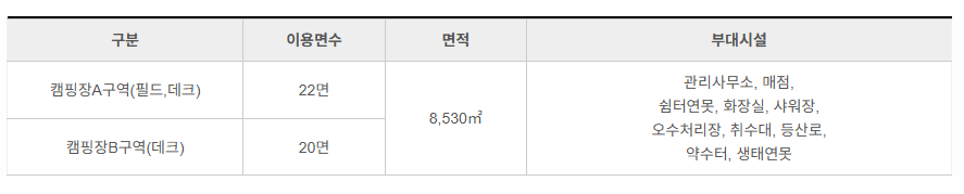 - 주요 시설: 화장실, 샤워장, 매점, 약수터, 어린이 놀이터 등