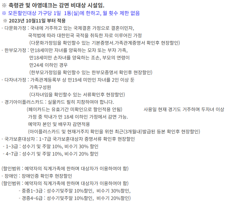 경기도민이라면 놓치면 손해! 월초에 진행되는 추첨제와 동일 기간 내에 경기도민 우선예약이 가능하다는 사실, 알고 계셨나요? 아래 표에서 정확한 혜택을 확인해보세요.