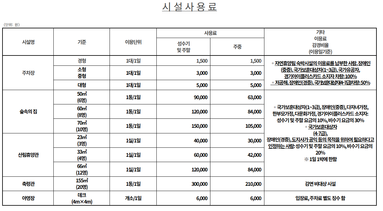 - 숙박료: 숲속의집 6인실 90,000원 / 8인실 120,000원 / 10인실 150,000원