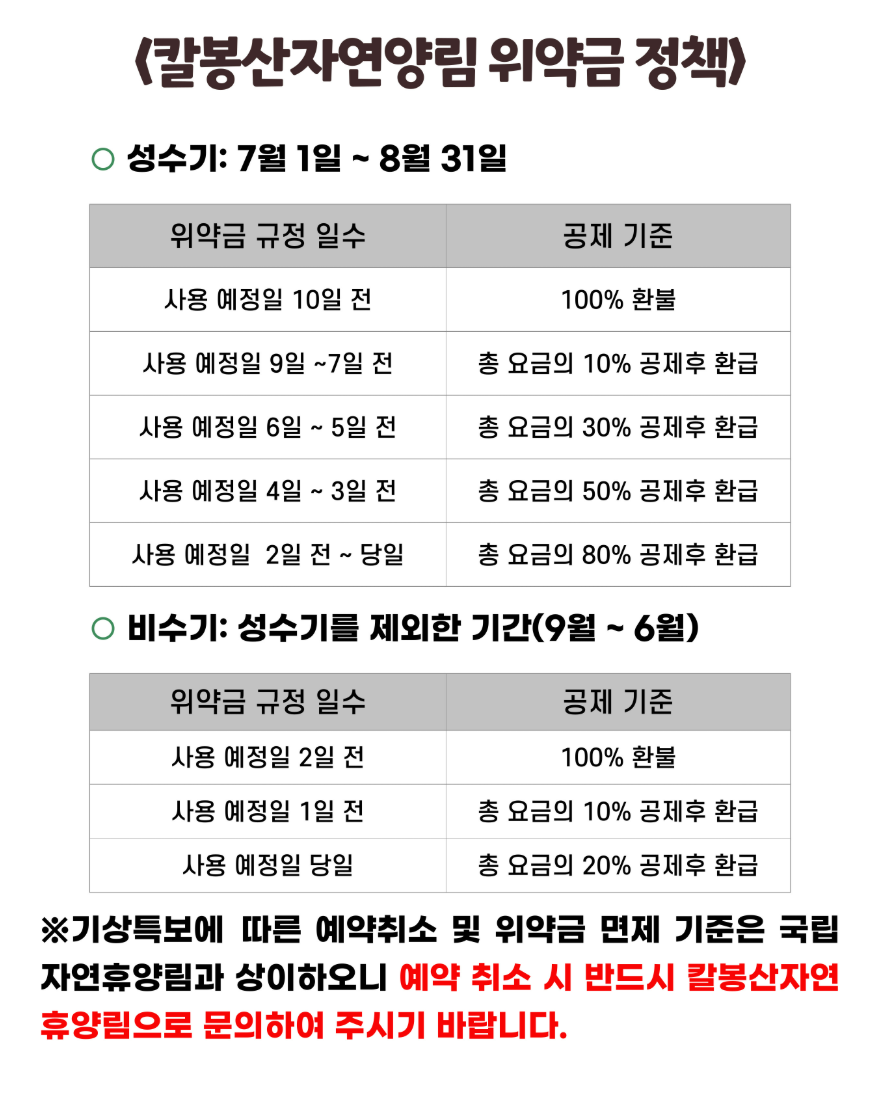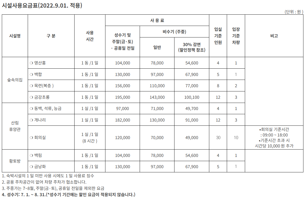 | 예약 조건 | 1인 1회, 최대 2박3일 / 숲나들e 인터넷 전용 |
