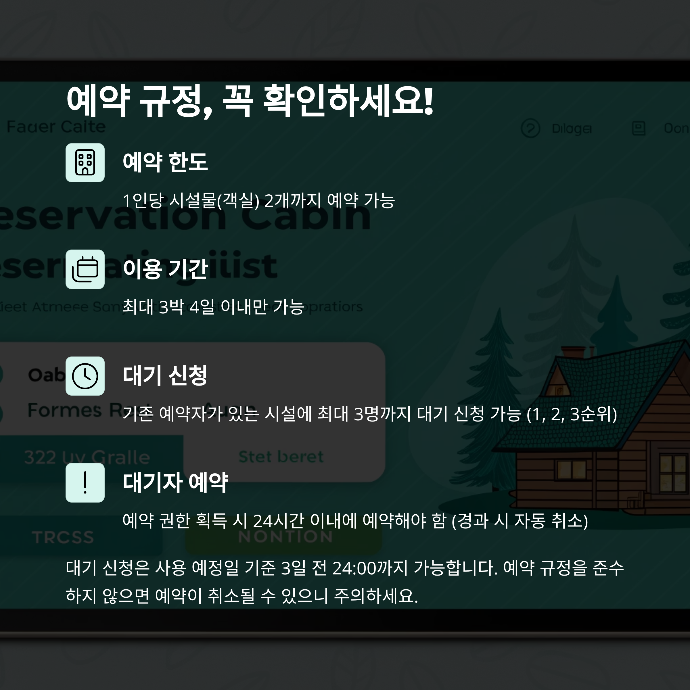 처음 예약해보는 분들이 실수하기 쉬운 몇 가지 규정들이 있어요. 아래 리스트를 꼭 참고하세요.