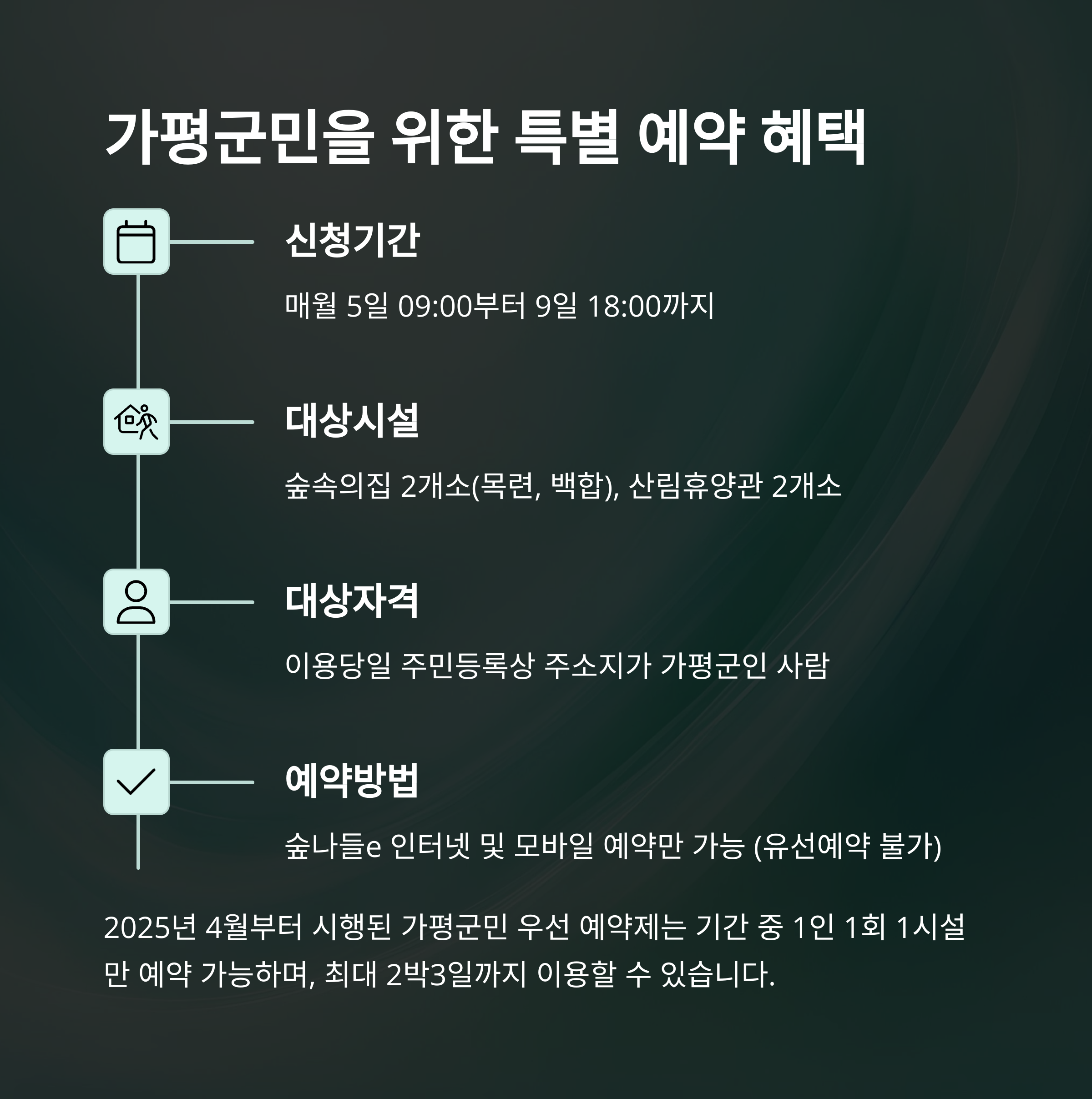 2025년 4월부터 시행된 가평군민 우선 예약제는 군민들에게 소중한 자연공간을 조금 더 편하게 제공하기 위한 제도입니다. 이용당일 기준 주민등록이 가평군으로 되어 있는 경우 아래와 같은 조건으로 우선 예약이 가능해요.