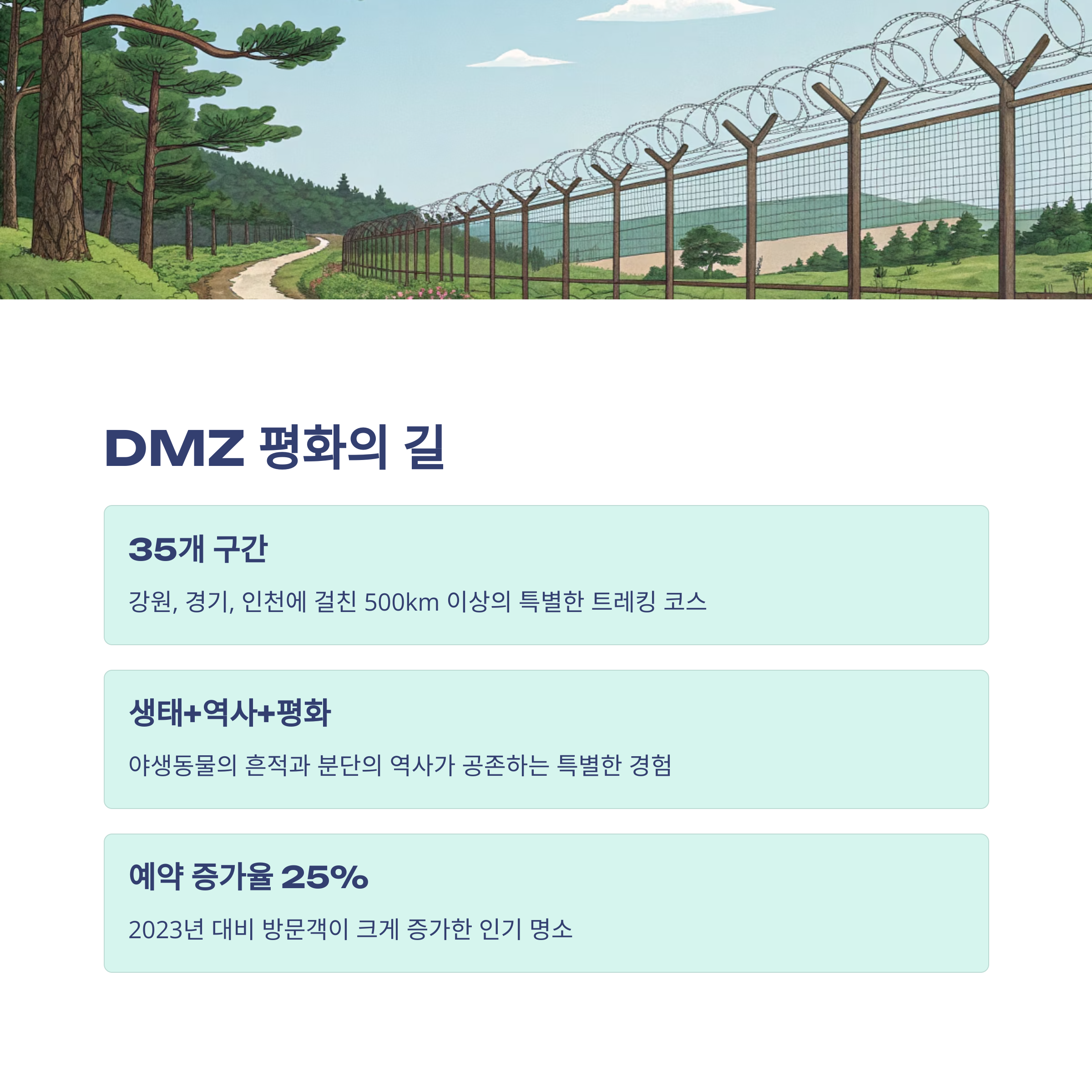 강원, 경기, 인천에 걸쳐 35개 구간으로 나뉜 DMZ 평화의 길은 단순한 트레킹 코스 그 이상이에요. 생태와 역사, 그리고 분단의 흔적이 모두 담긴 이 길은 정말 특별한 경험을 선사하죠. 야생동물의 흔적과 비무장지대의 긴장감이 공존하면서도, 어딘가 모르게 평화롭고 고요한 분위기가 느껴지는 이상한 감정. 걸으면서 묘한 감동이 밀려와요.